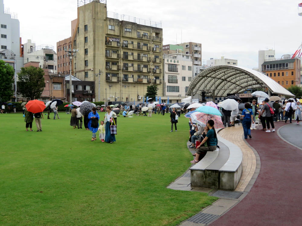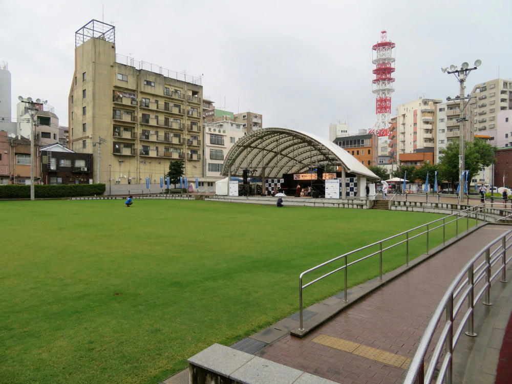 I stuck around until 5 PM, when it started raining again. I went home to do a little work on the computer, then came back at 7 PM to catch the last of the show in front of 7-11. The Ten Park main stage closed at 6:30 PM, but 4 of the satellite stages (7-11 and Takapla in Tenmonkan, Amu Plaza, and Ginza Street near Amu Plaza) had music from 7 to 9 PM.