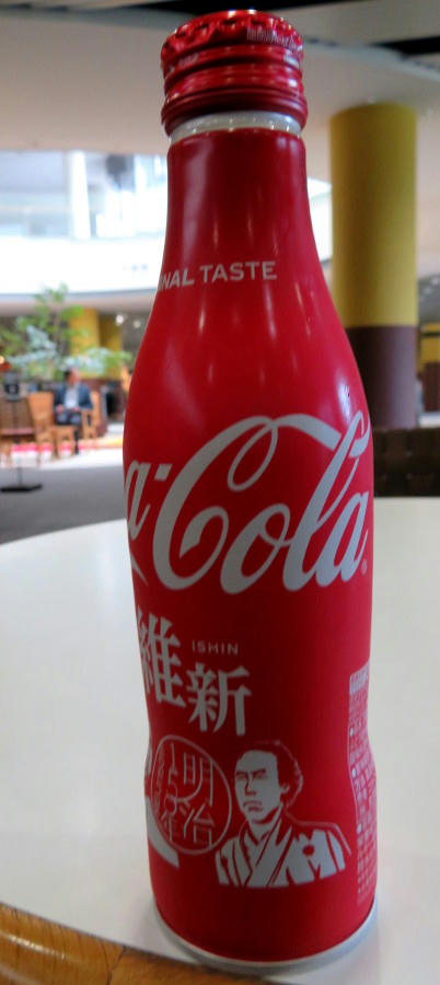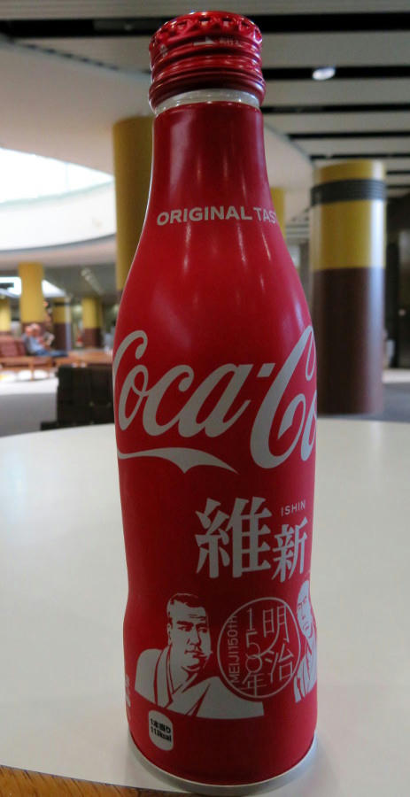 Coke is trying to capitalize on the 150th anniversary of the Meiji Restoration (when control of the government was taken from the Shogun and returned to the emperor in the late 1860's), with this aluminum bottle featuring Saigo Takamori,
