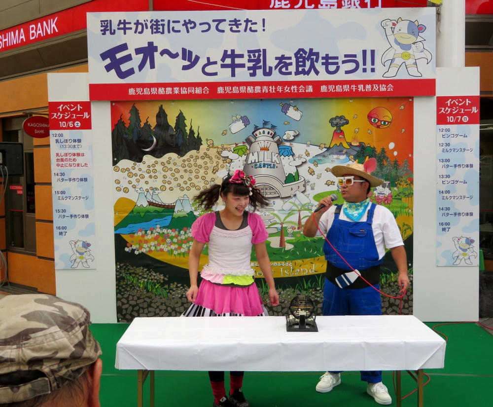 Friday, we got some rain and strong winds. Saturday, the wind had subsided, but there were still occasional drizzles. Nothing that would have kept the crowds away from curry, though. Last weekend, Amu Plaza had their Marugoto Fair, promoting local Kagoshima products, which was supposedly going to happen two weekends in a row. But, they'd cancelled last Sunday due to Typhoon #24, and I expected that they'd cancel again this weekend, too, so I didn't bother trying to go up to Amu Plaza on Saturday after my lessons finished to find out. I did have to work from 1 to 5 PM Saturday afternoon, but my 6 and 7 PM lessons were cancelled because those students had school exams they had to take at that time. As I was walking through Tenmonkan on my way to the school at 12:30 PM on Saturday, I discovered that the Japan Milk Council, and Daily Milk company were running another of their milk and bone loss awareness events in front of the 7-11 there. Activities included bingo (no idea what the prizes were), free samples of Daily milk, bone loss testing, a stage play promoting proper dental care, and a demonstration of butter churning. The people handing out milk didn't bother giving me any (which was ok, I'd just bought the week's worth of milk before heading for the school), and the stage event was just the bingo game, which was almost half over. I took a few photos for the blog, and kept walking towards the school. The milk fest ended at 4 PM, but was scheduled to continue on Sunday. I did want to see part of the butter churning demo, so I made a mental note to get back to Tenmonkan at 1 PM for that.
