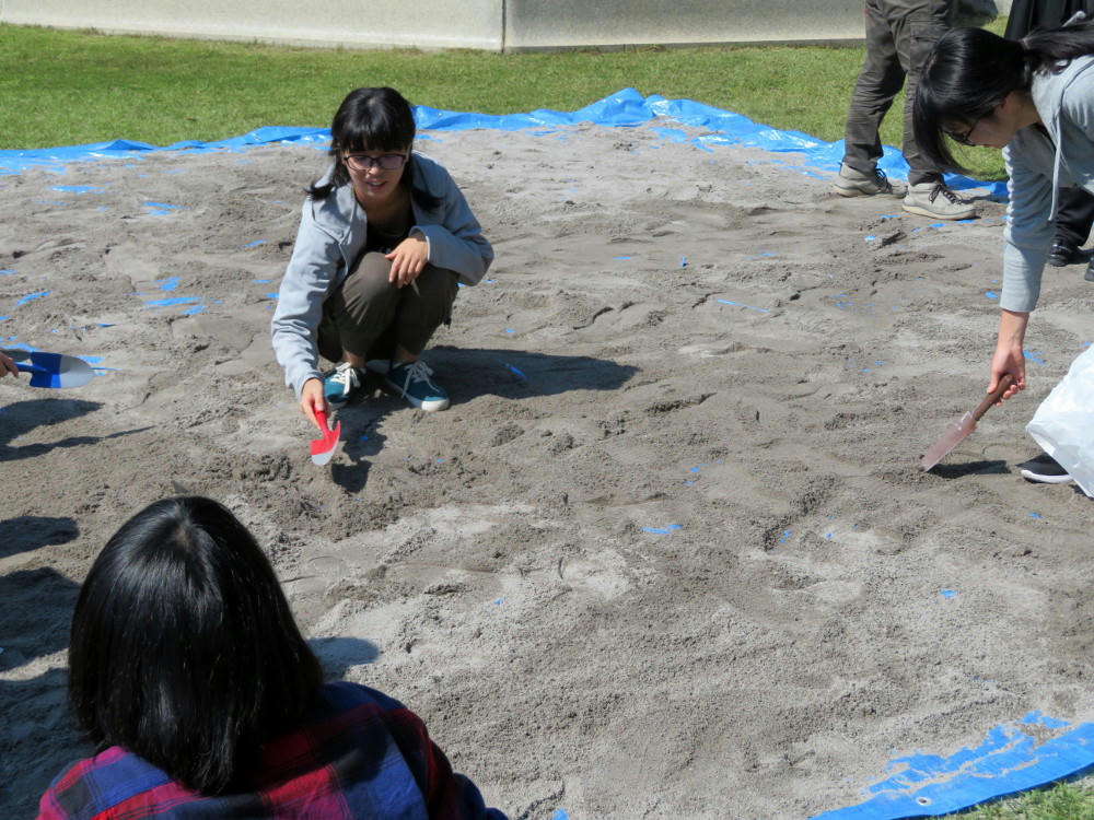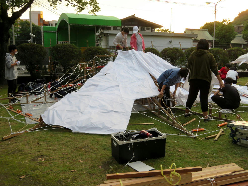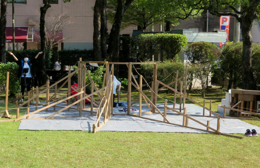Back at the shrine park, the rope and wood frame is looking more like a volcano.