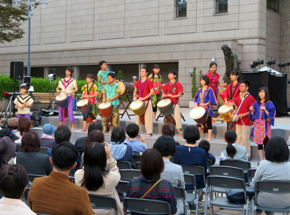 As mentioned above, I had a break in lessons between 5 and 6 PM. The stage in front of the art museum was to have a wide variety of music, plus 5-minute light and music show at 7 PM. Here, we have a university band playing music from Africa. I recorded part of that (below).
