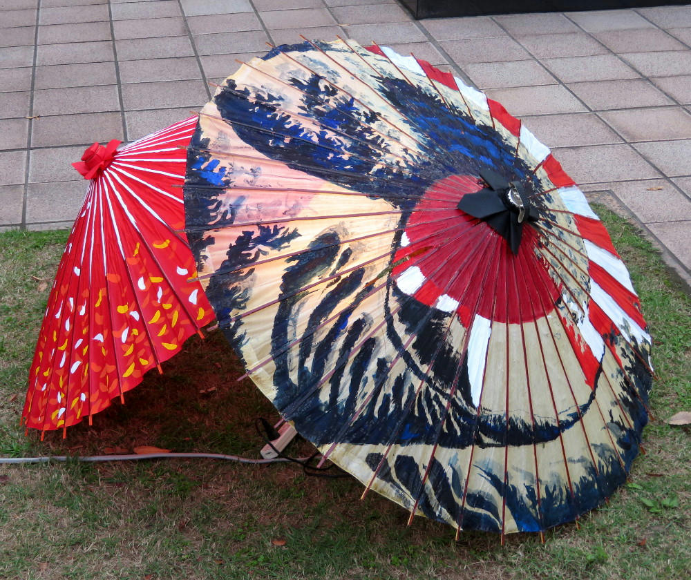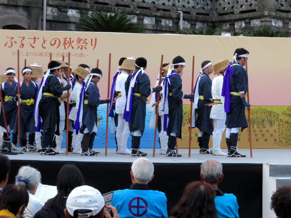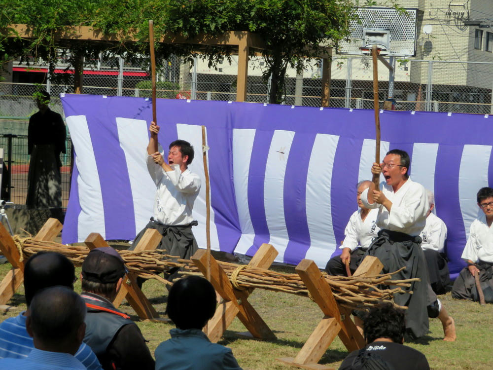 The Furosato stage did have stuff starting at 11:30 AM, Saturday, but I needed to do milk shopping for the week, and get ready before heading out to teach lessons from 2 PM to 8 PM. I made a point of getting out the door at 1 PM. When I got to the Furosato stage, the Jigenryu martial arts school was putting on a demo. Jigenryu has over a 200-year history, and was the sword art Saigo Takamori studied. Originally, the idea was to practice by using a large piece of wood to smash up a larger wood pole. In practice, you arc the sword up and down over your head while approaching your opponent with short quick steps, and screaming your lungs out. There's no concept of defense, or blocking an opponent's attack. You just aim forward and hack up everything in your way. Now, they just use a pole to smash up other sticks.