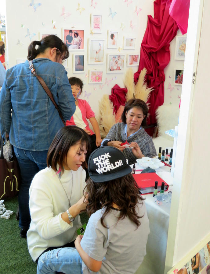 Over at the "body jewelry" booth, which is just another name for face and body painting, we've got a young girl getting face paint.