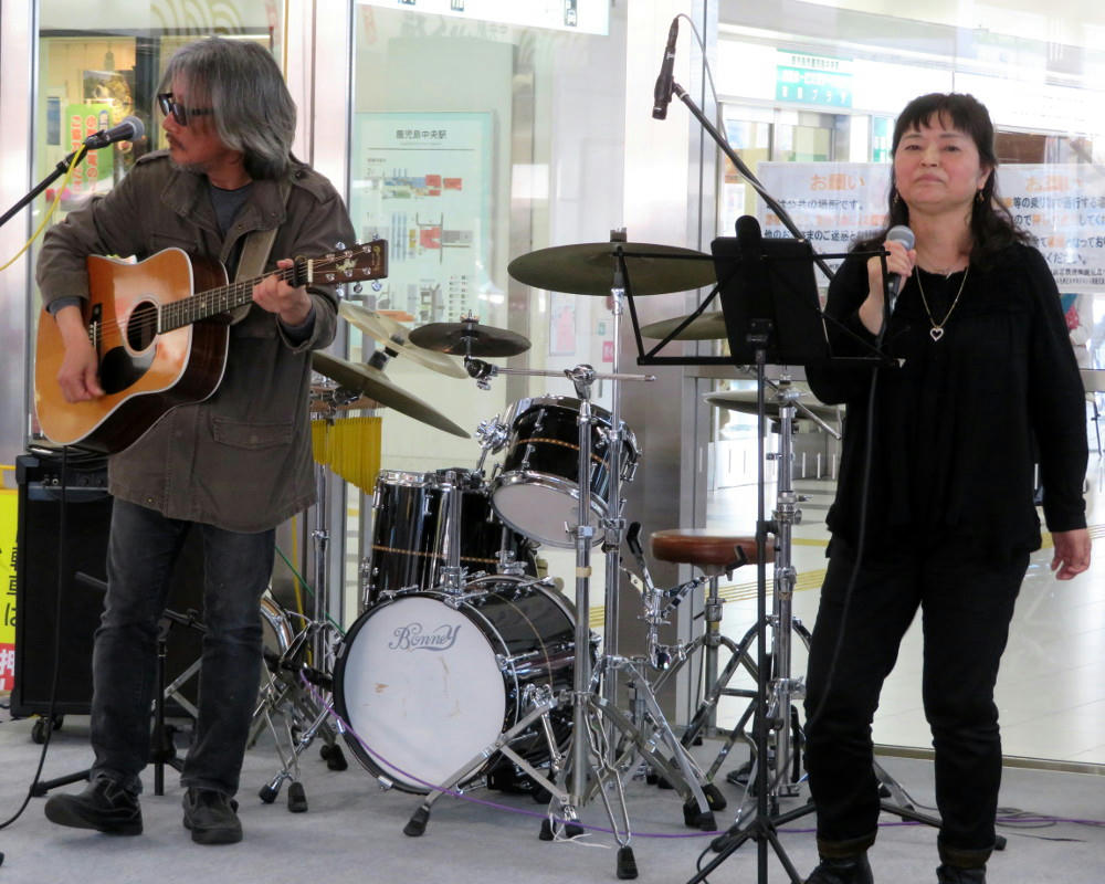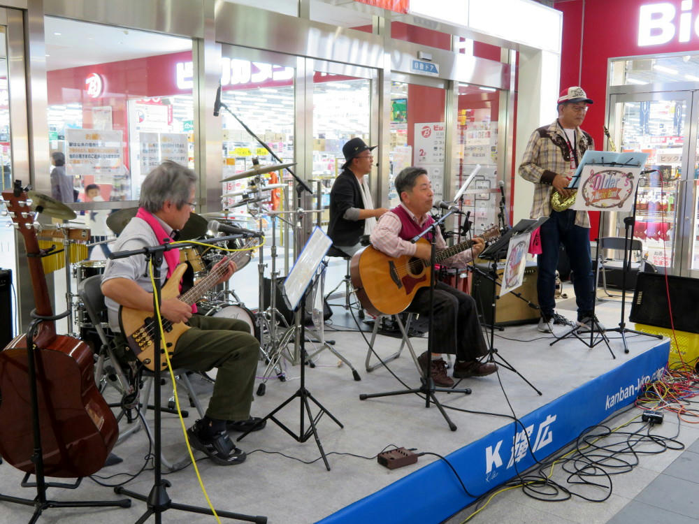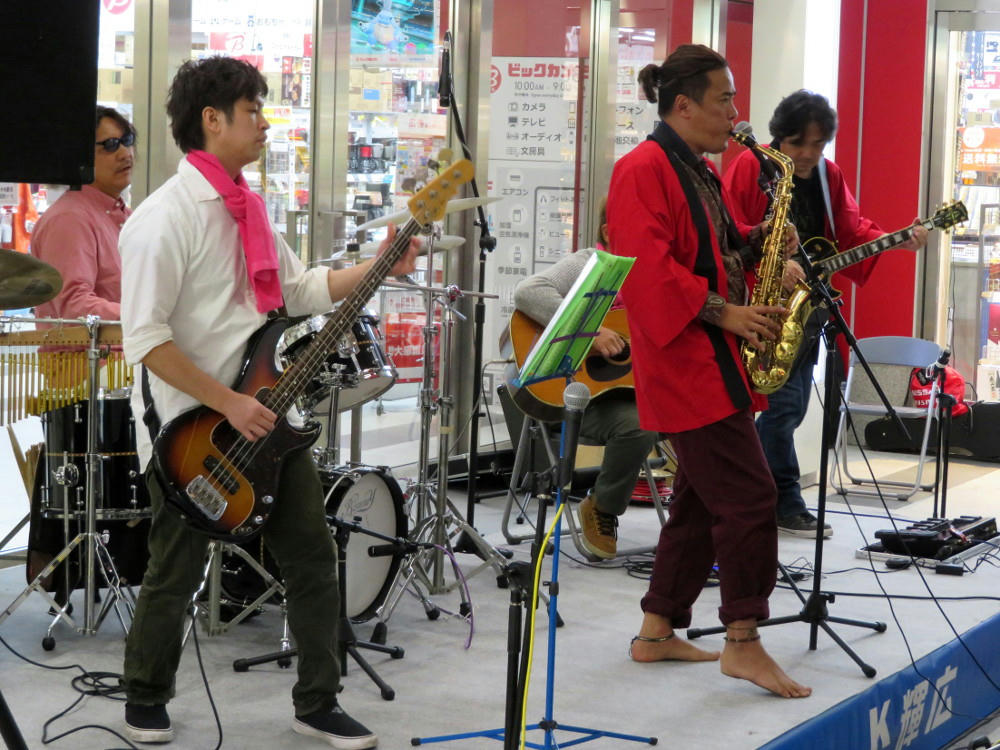 The band scheduled at 5:10 PM was Opposite, but half the set was fronted by the guy on the sax, and the other half was by a younger woman. I don't know if both sets were "Opposite," or not. Anyway, they did halfway decent rock. I've seen the sax player several times before at the Kagoshima Music Fest held in May, and he was always hanging out with musicians I knew. I had no idea who he is, or why those musicians knew him. This is the first time I've seen him on stage. He's an average singer/front man, but he plays a mean sax (when he plays. He was on sax for only about 15 seconds in the middle of the song.) The thing is, he spent a lot of time sitting in front of the main mixer board, so he's either a producer, or an audio engineer for one of the local studios. I suspect he may be with Walk-In Studio. I still haven't talked to him at all.