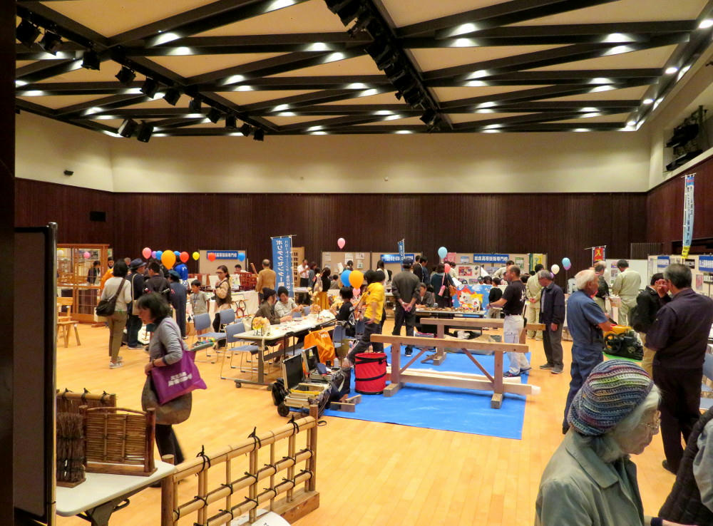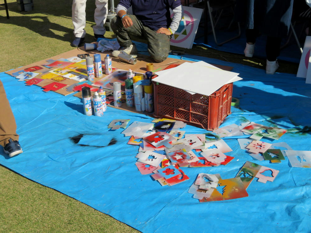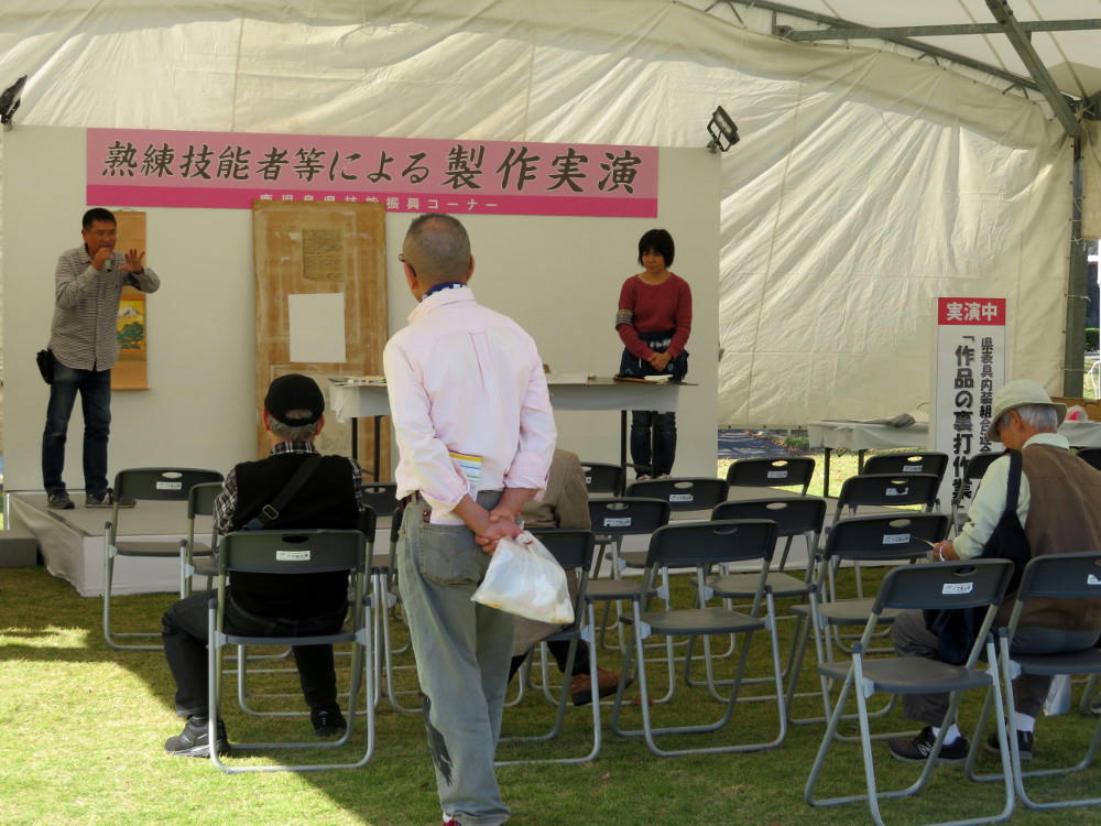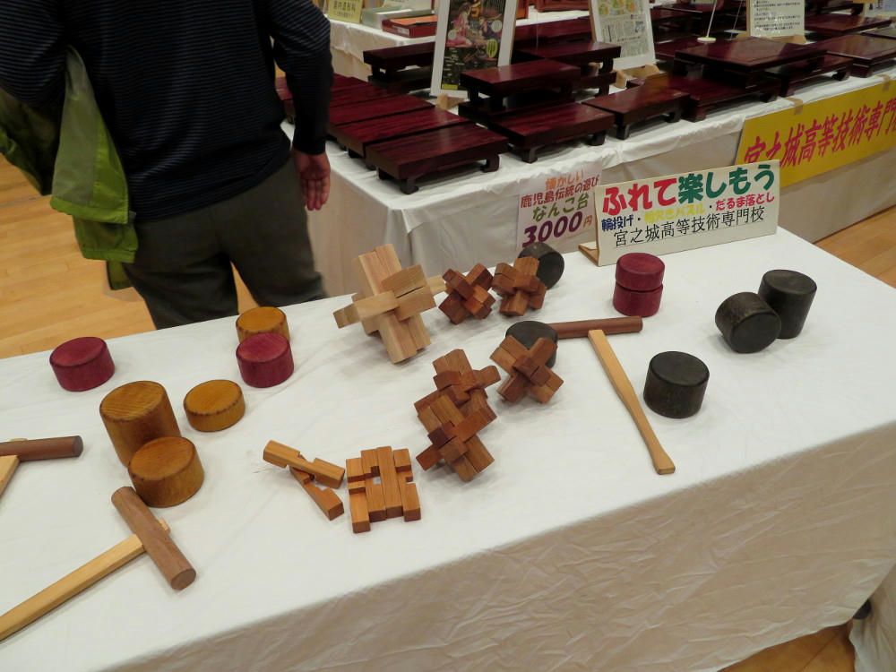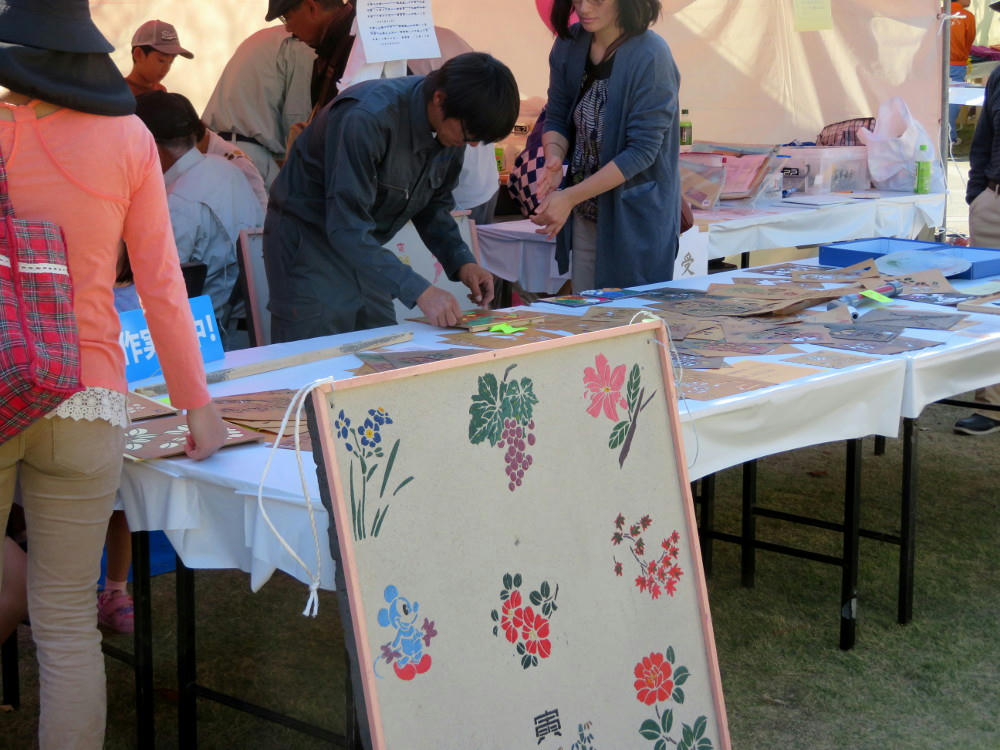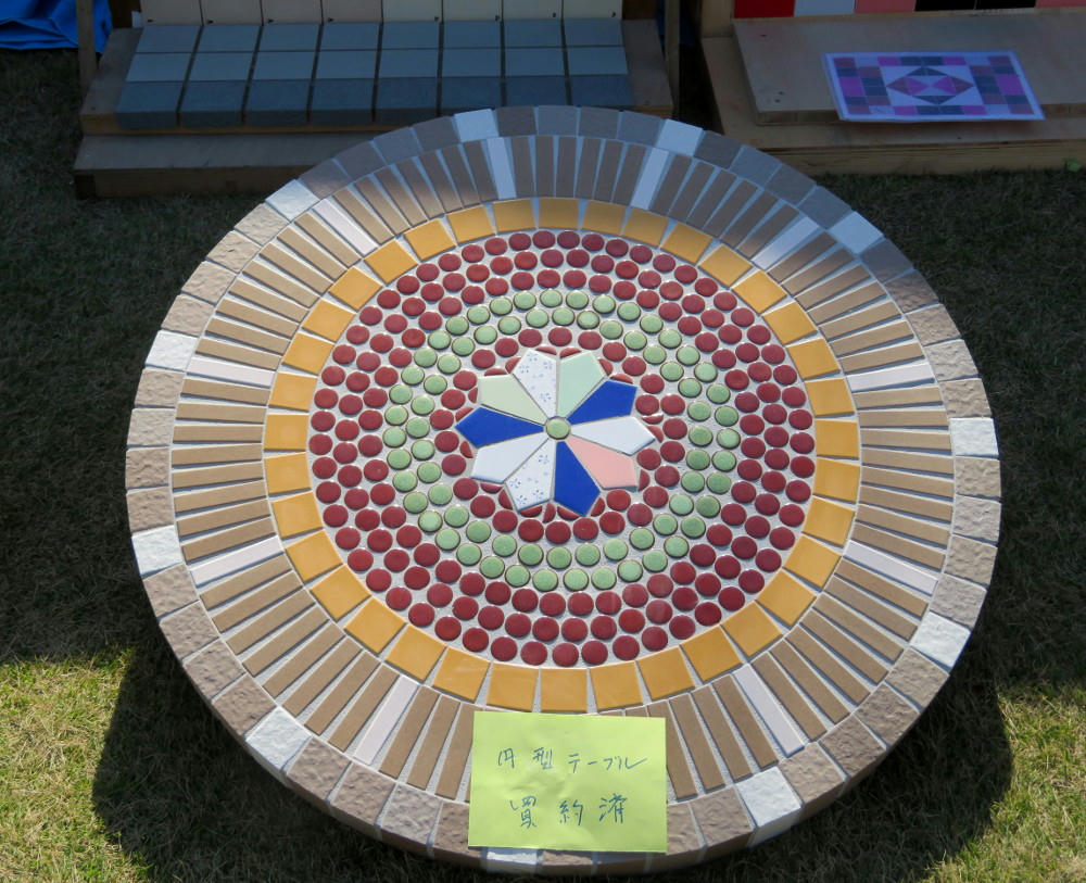 My understanding is that some of these booths were run by construction companies or related technical schools. A lot of the visitors were active making tiles, learning how to pound nails into wood, trying their hands at copper and tin plate embossing, and stencil spray painting. Here, we've got tiled table tops.