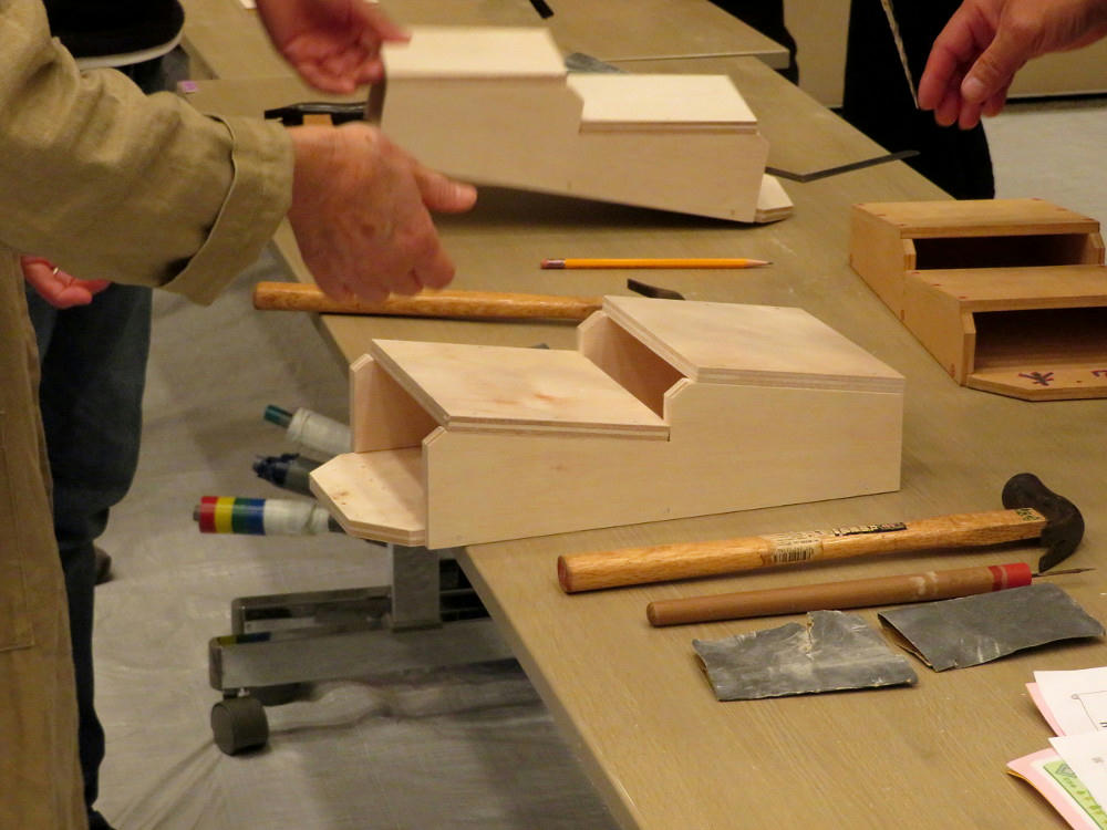 As this one guy was trying to pound the one piece into place in the second piece of wood, the piece he was sitting on kept sliding under him. Eventually, one of the older men told him to pop up a peg in the bench behind him.