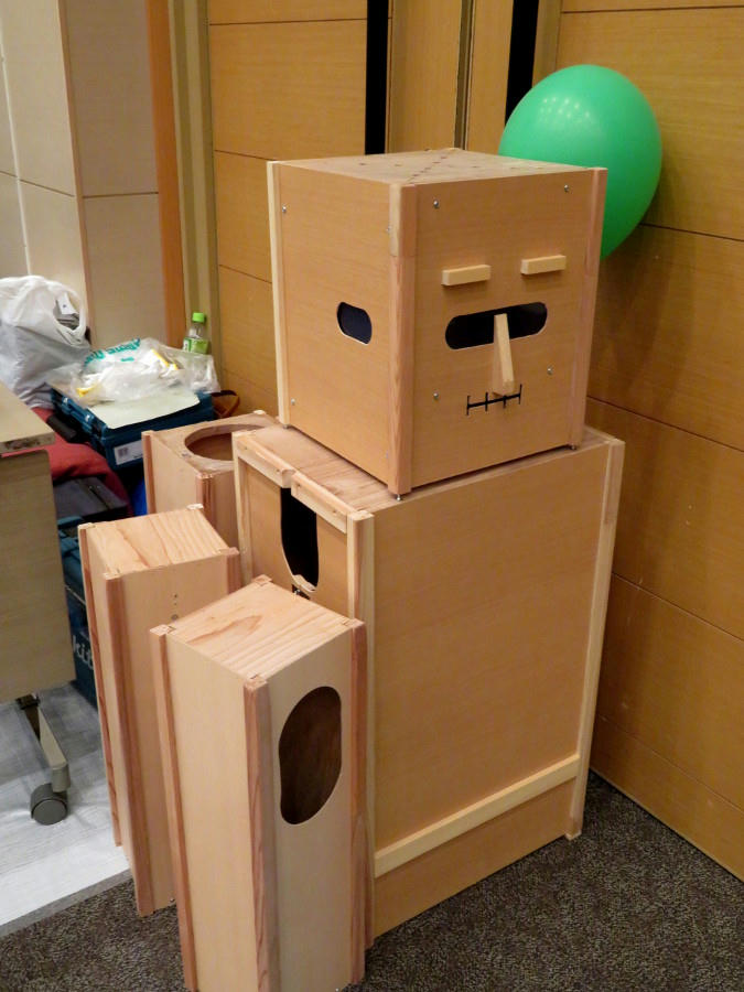 The outdoor space had a couple food tables, this presentation stage (used for different slide shows and a demo for making a small bookcase), and over 10 activities booths (see below).
