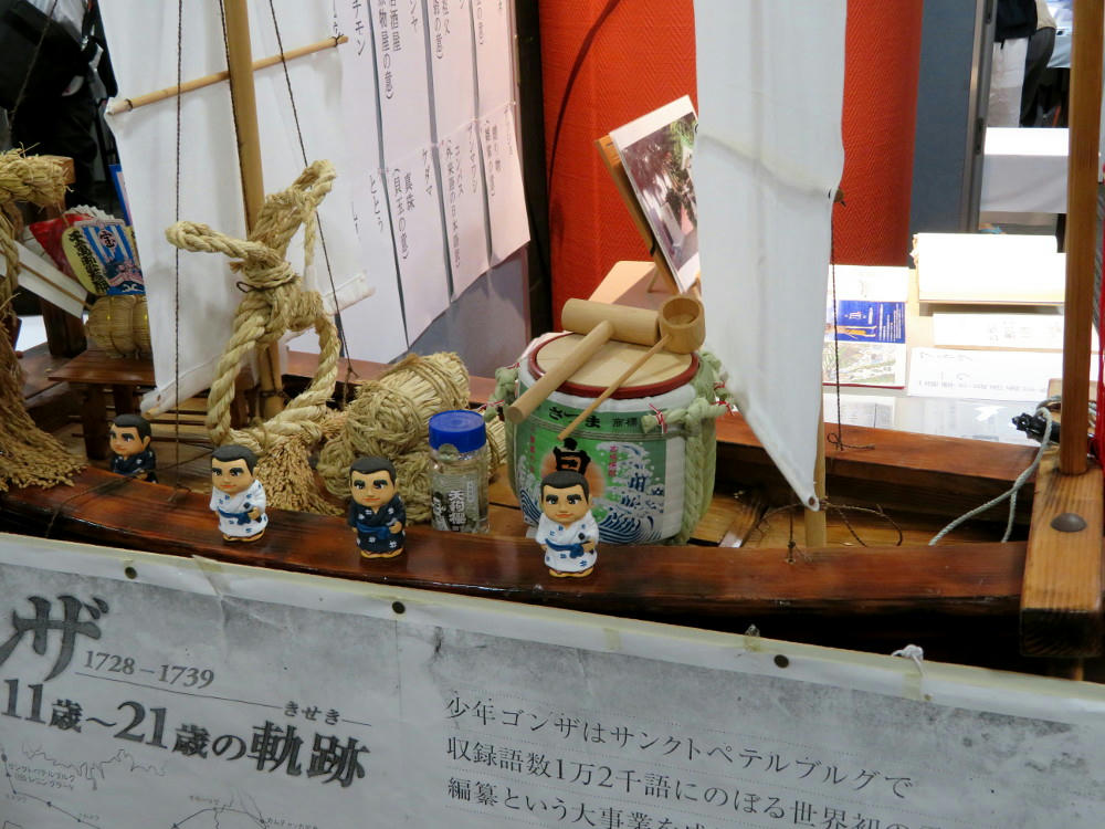 One of the other tables had this model wooden boat, with packages of shochu, and a bunch of Saigo Takamoris. (Reminds me of the 3 sets of actors (Saigo, Okubo, and Oryo) the previous weekend.) The paper tacked in front of the boat discusses Gonza. There's really not a lot of information on the net, in English or Japanese, about Gonza, but he's something of a local legend. Born in Kagoshima in the 1700's, his father apparently intended to take him by ship to northern Europe, but the ship encountered a storm and was dashed on the rocks somewhere around the Russian coastline. One Russian tribe discovered the survivors and killed everyone but the young boy. Gonza grew up in Russia, creating the world's first Japanese-Russian dictionary (not an easy feat, given that he left Japan at age 5 or 10, or something, and didn't know that much Japanese at that time). He died in Russia at age 21. Coincidentally, the merchants in Tenmonkan, on Gonza Street, had a 300th year anniversary event on Sunday.