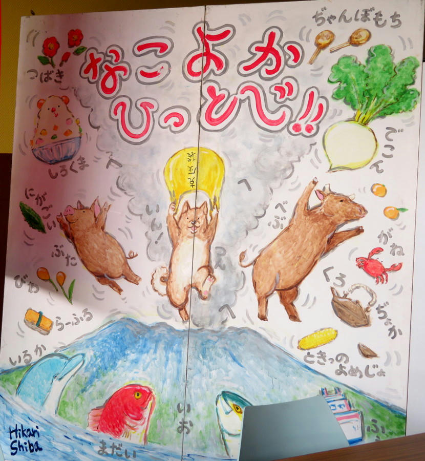 A nearby board in Kagoshima dialect, reading "nakoyoka hittobe," which in effect can be thought of as "let's get closer together by having fun together."
