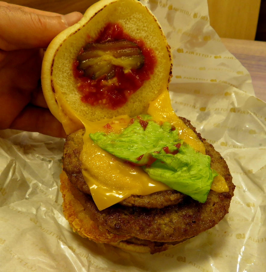 The number "29" can be written as "ni" (2) and "kuu" (9), which sounds like "niku", or "meat." A number of fastfood joints will have a Niku Day toward the end of the month, where they sell bigger burgers for around 500 yen. Lotteria pretty much does this every month, but they'll change up the sandwiches each time, and the prices may vary. I've had a couple of the meat day burgers before, and they haven't been that good. I knew what I was getting into, but I also wanted to get a hamburger again (it's been a while). The choices were a "rib" sandwich, a burger with double patties and a hash brown thingie in the middle, and a double chicken sandwich.
