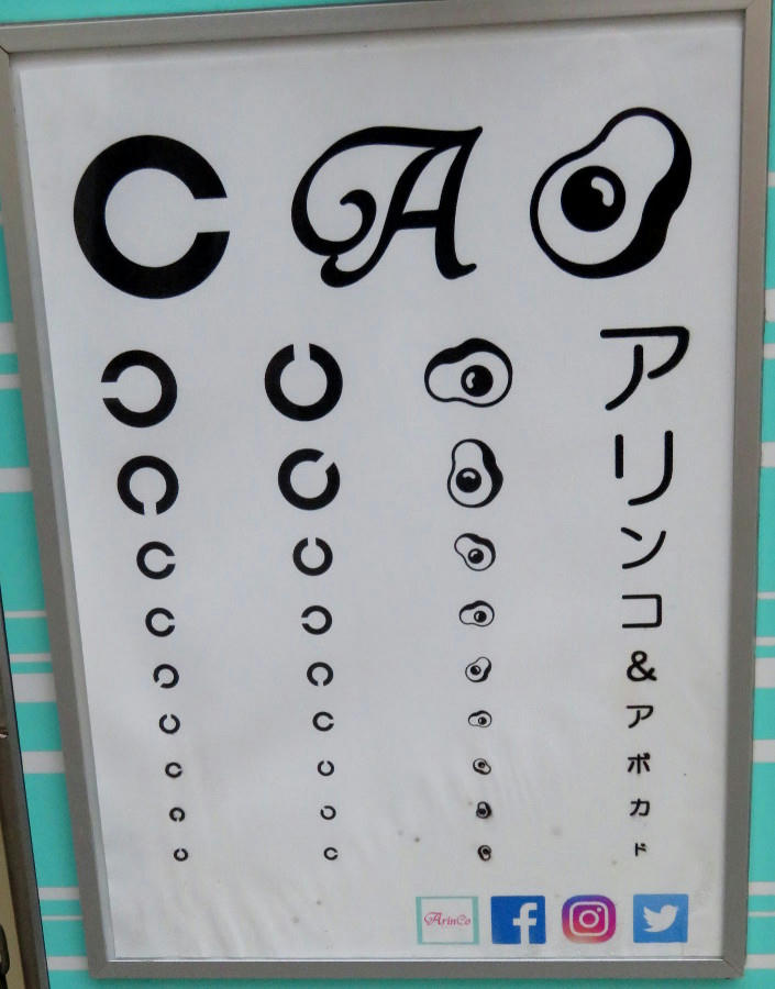 I'm really not sure what kind of shop Arinco is, if it's a beauty or hair salon, but the sign here reads "Arinko and Avocado", and uses avocados as part of an eye chart.