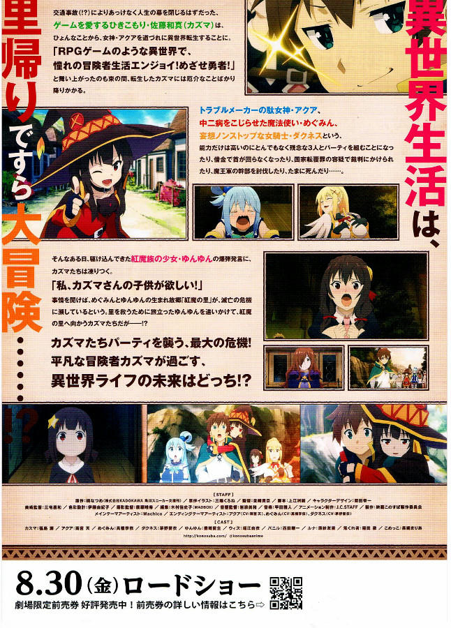 First is for something called "Kono Subararashi sekai ni shukufuku wo! Legend of Crimson" AKA: Kono Suba ("God's Blessing on this World"). According to the wiki article, it's a parody of Japanese RPGs, which started out as a web novel, got turned into a light novel series, and then adapted to manga. The movie is an adaptation of the manga. For RPG parodies, I prefer Dragon House Hunting.
