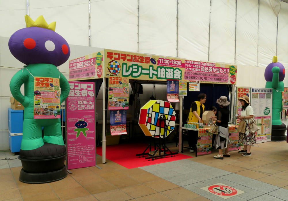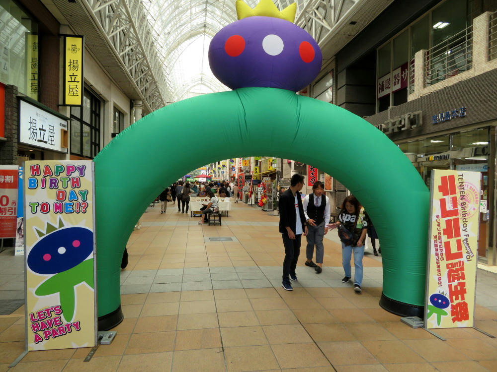 I was kind of excited going into this weekend. I'd seen posters for Ramen Oh (the competition at Dolphin Port for who has the best ramen), Light and Sound Road (art exhibits by high school and university students lining the road in front of the Kagoshima Art Museum and in Terukuni Shrine, plus live music), Tenten's birthday, and a Food and Wine event. Tenten is the green alien mascot for Tenmonkan, and the arcade was celebrating his 10th anniversary. The signs indicated there'd be a jump room, other activities for children, and maybe a live stage.