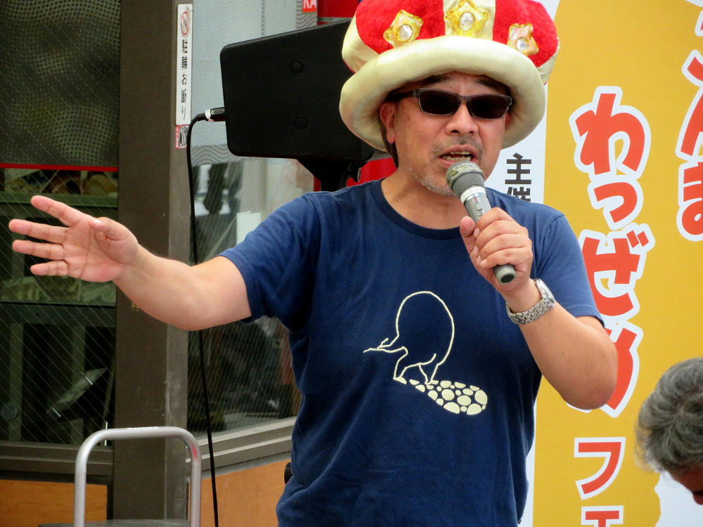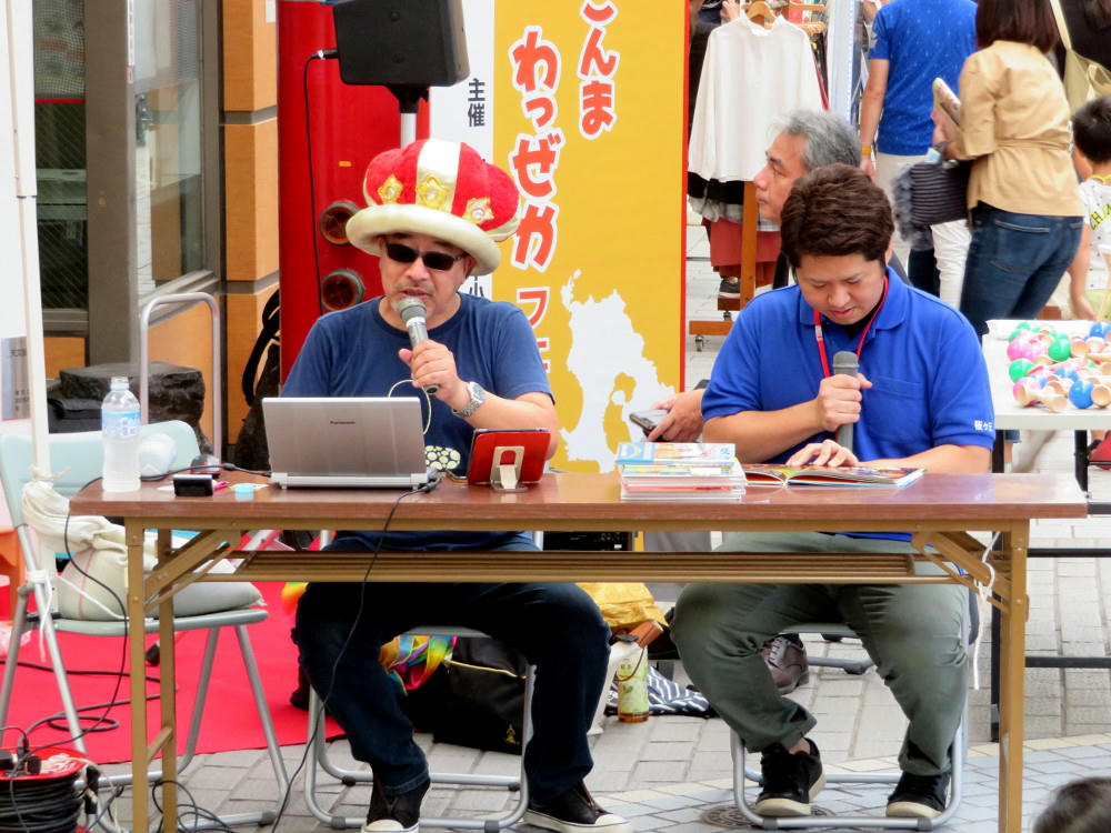 I could hear someone shouting over the PA system, and there were display panels in the arcade walkway. When I got to the intersection, I realized that I was looking at Satoshin, the children's book illustrator who's most beloved character is a turd (also, author of "Maa, ii ka?" ("It's Alright")). He and a colleague were narrating one of Satoshin's books, displayed on the projector screen as a Powerpoint file. Both the children and their parents loved it.