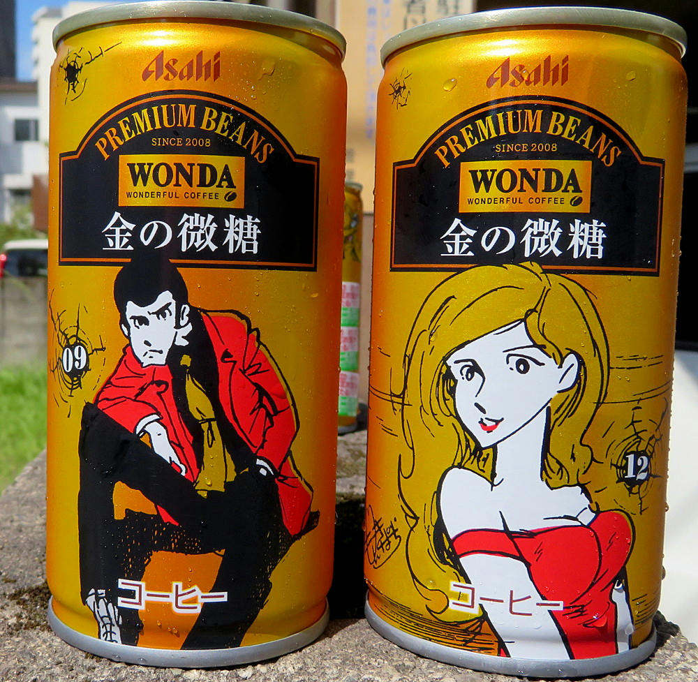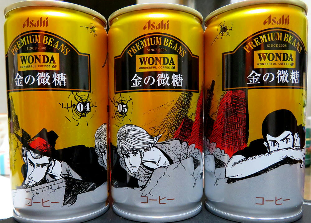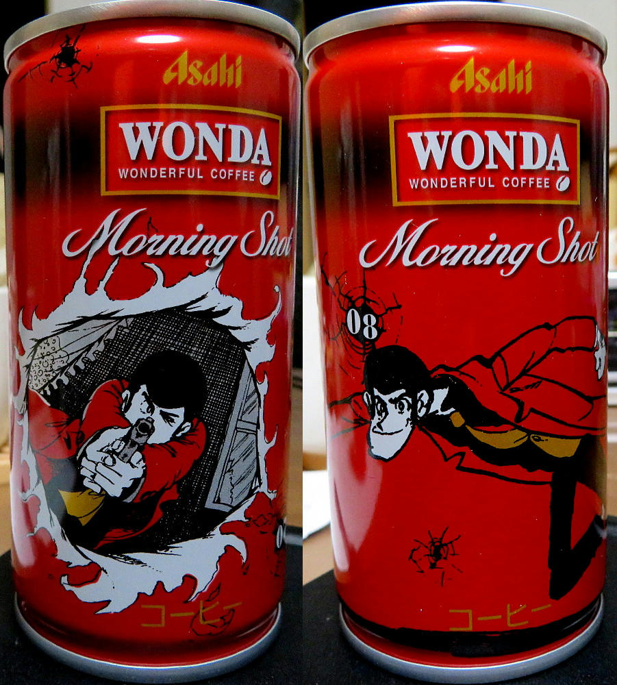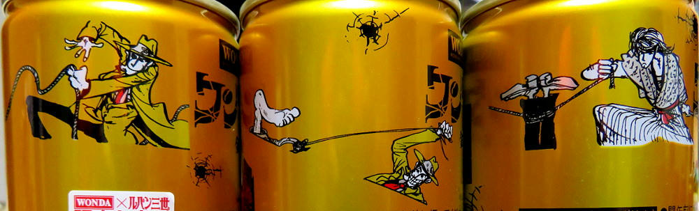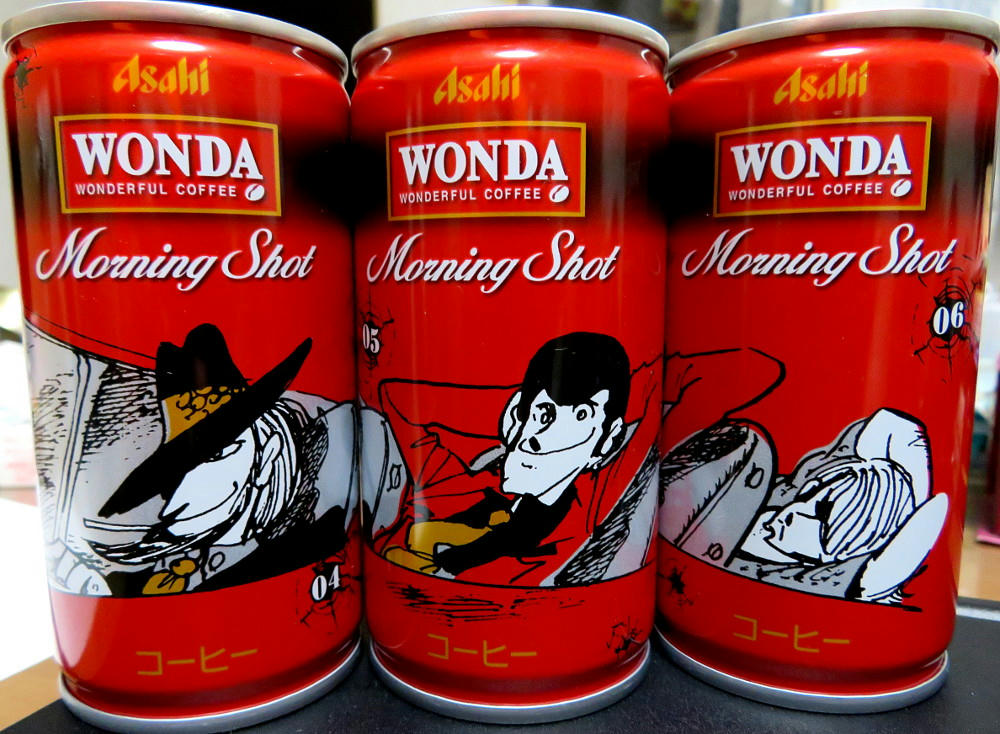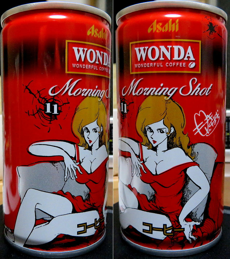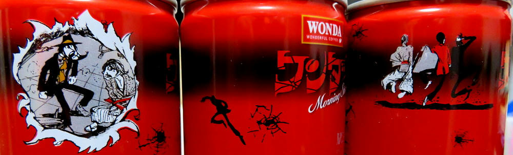 The Wonda campaign page has a display of all of the cans (4 at a time) in both the Red and Gold series. What I didn't notice right away is that #11 and #12 for both sets are marked "Rare." If that's really the case, I've been lucky in getting everything but red #12 so easily. The thing is, that one has what's arguably the best artwork for Fujiko, and I can see why it may not have stayed on the shelves like all the others have. I'm not sure if the stores restock when inventory gets low. As mentioned before, not everyone carries the same brands (one place may not have either line, while another has only the red cans, another only gold, and yet another has some of both). I can try revisiting the places I know have Morning Shot, and hope I get lucky. Or, if I feel brave and no one else is in the shop, I may try asking the clerk if they have #12 in the back somewhere.
