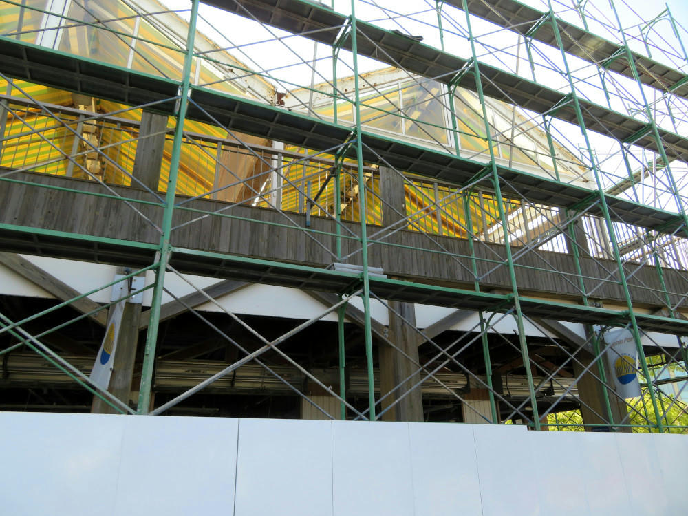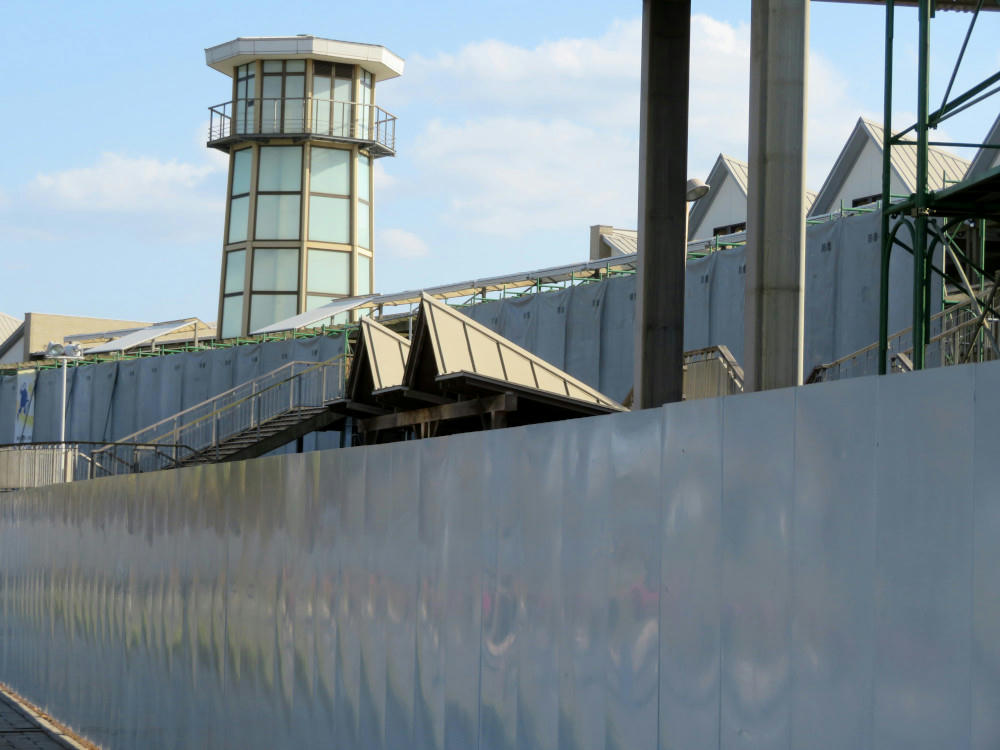 I went back one week later after my classes ended on a Saturday (Apr. 11), and all the shops were shuttered, the parking lot empty except for the cars for the work crew, and the bottoms of the crossover stairs blocked off. The electrical boxes for the walkway lights had been ripped out, and the trash was being taken out for disposal.