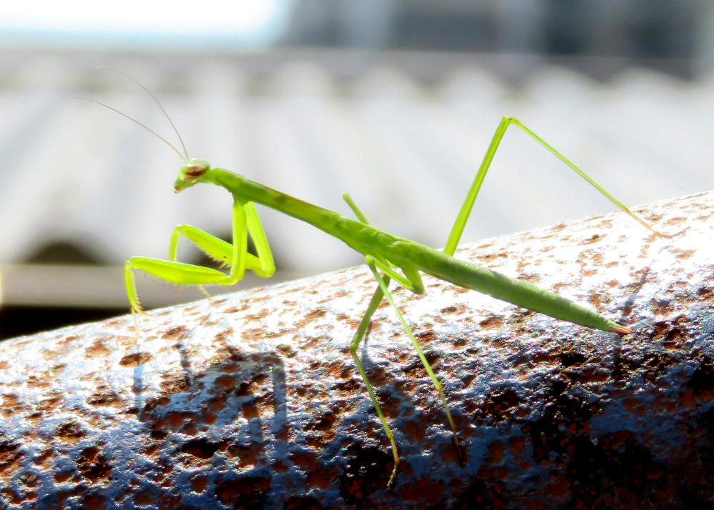 Bit of a Small Adventure this time. I'd gotten down to Minami Kagoshima one morning, by streetcar, and was waiting for the barrier rails to go up so I could cross to the other side of the tracks. While I was waiting, this young kid half-runs down the ramp leading to the main train station platform, and calls out someone's name, looking frantic. Both the driver of the streetcar at the platform and I are watching the kid to make sure he doesn't run under the guard arm and in front of the car before it leaves. When the streetcar pulls out and the arms raise, the kid half-runs back up the ramp, then turns and sees me crossing the tracks. He runs back down right in front of me with his arms outstretched, telling me that I can't go past him. I'm confused, so I take a half-step forward, and he jumps back and repeats "you have to stop." We repeat this little game a couple times, until we get near the top of the ramp, and he steps aside, looking a little disappointed. He points back down the ramp at the platform we'd just left, and I try to see what he's talking about. I don't, so he points again, and I realize that there's a little baby praying mantis sitting on part of the iron railing a foot or two from me. The kid's really excited by his find, and tells me that it had crawled close to 10 feet along the railing before stopping. I let him talk a bit more, and then thank him and leave because now I'm getting close to being late.