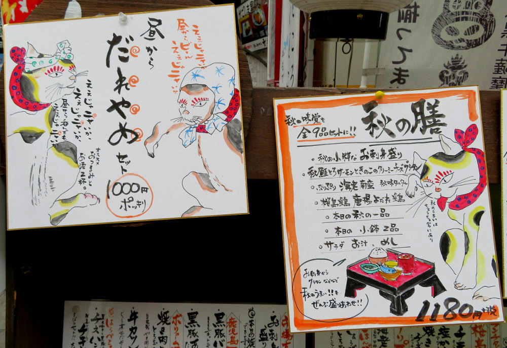 I like these menu cards for a restaurant in Tenmonkan. The artwork is all based on famous Ukiyo-e woodblock prints, and are promoting specific meal sets.