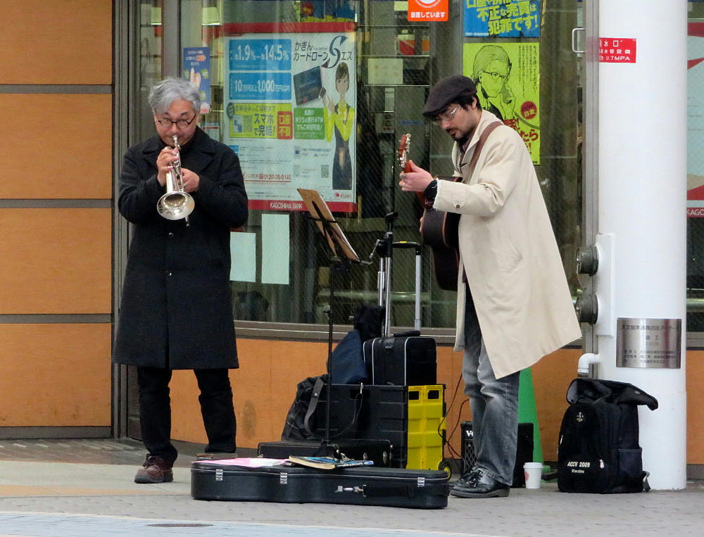 A pair of musicians playing for change in Tenmonkan. The trumpet player is good, but not great. The guitarist was ok. No idea what names they're playing under.