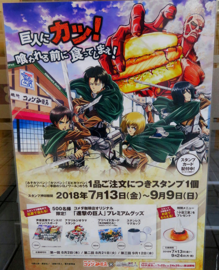 This is pretty pathetic. Komeda Coffee shop has teamed with Attack on Titan. Every order gets you a stamp. A bunch of stamps (over $20 of purchases) will get you Attack on Titan goods, or a cup of coffee. This campaign has been running since July, but I just noticed it last weekend.