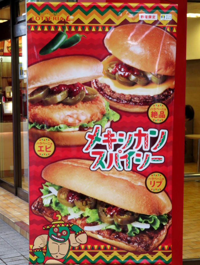 Lotteria's idea for a "Mexican spicy" burger is to take a regular burger (shrimp patty or "rib" strip), throw on a few pickled jalapeno slices, and add extra ketchup. Then bump the price by $1. Sigh.