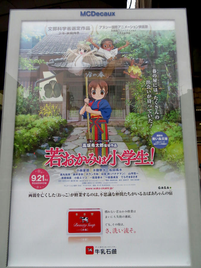Poster for a new movie coming out: Waka Okami wa Shougakusei! (The Young Innkeeper is a Primary School Student!) I find it interesting that one of the sponsors is Kao soap. Based on the children's novel series by Hiroko Reijo, which was turned into a TV anime series in April. Not much on it in English yet.