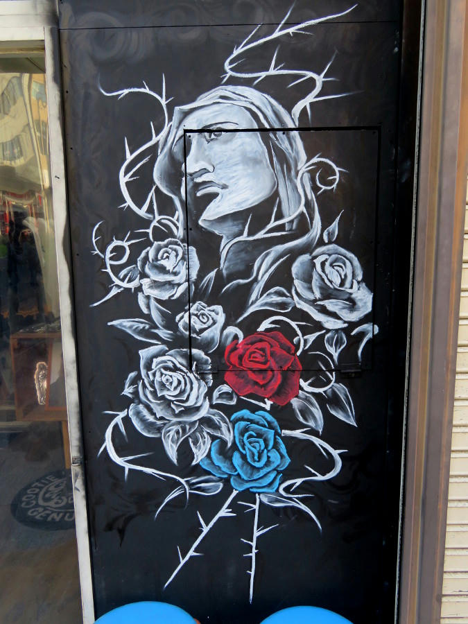 More chalk art from the Bright used clothing store. These are the days of Guys and Roses.