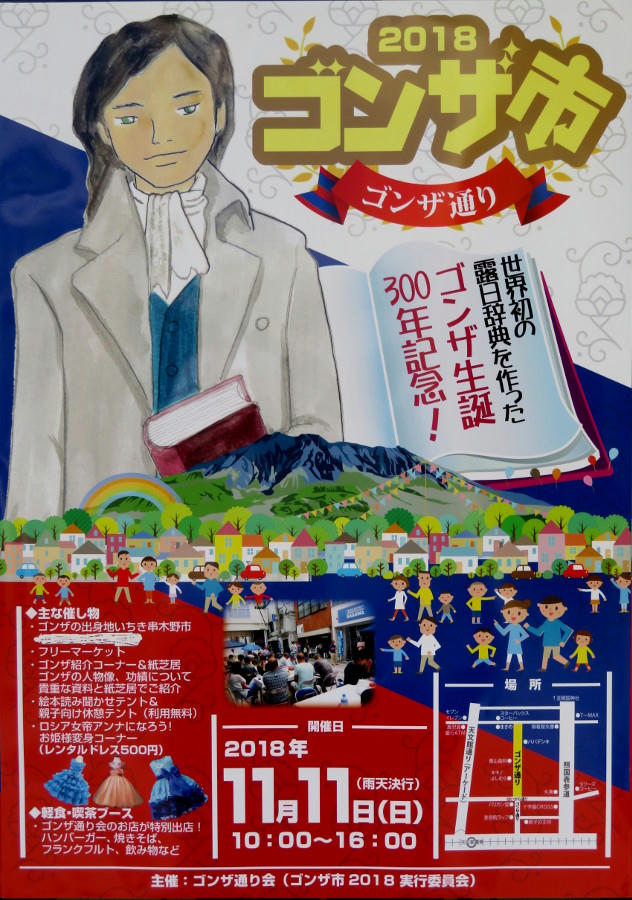 I mentioned Gonza in a previous post. Back in the 1700's, his father wanted to take him by ship to Europe, but the ship crashed along the Russian coast, and one tribe discovered the survivors and killed everyone but Gonza. While he was alive, he compiled the first Japanese-Russian dictionary, but because he'd been so young when he left Japan, his Japanese vocabulary was limited. He died at age 21. He's considered something of a local legend, and some of the merchants in Tenmonkan have named their street after him. On Sunday, the Gonza Street merchants held a little festival to celebrate the 300th anniversary of Gonza's birth.