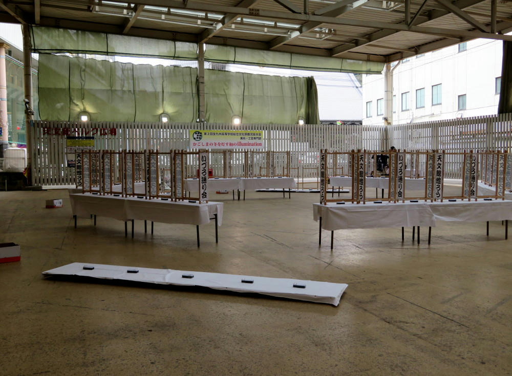 I think they're created by school students. The thing is, they're generally hung in front of the shops along the walkways. I'm assuming that a Shinto priest performed a blessing ritual on them earlier in the day, and that they'll be put into place in front of the shops in a day or two. After that, they won't come down until maybe Feb. or March.
