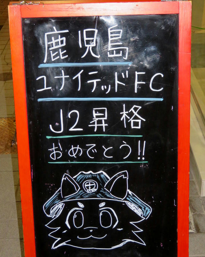 There's a hair salon in Tenmonkan that puts different pictures on their marker sign outside each day. On one side was a cat in a Sakurajima volcano hat, congratulating the Kagoshima soccer team on their latest game.