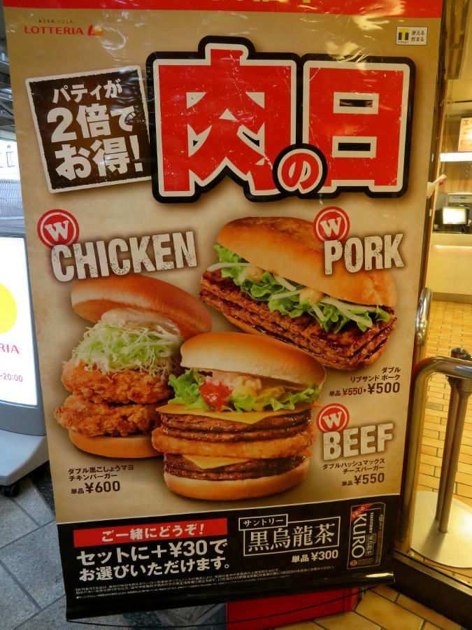 The number "29" can be written as "ni" (2) and "kuu" (9), which sounds like "niku", or "meat." A number of fastfood joints will have a Niku Day toward the end of the month, where they sell bigger burgers for around 500 yen. Lotteria pretty much does this every month, but they'll change up the sandwiches each time, and the prices may vary. I've had a couple of the meat day burgers before, and they haven't been that good. I knew what I was getting into, but I also wanted to get a hamburger again (it's been a while). The choices were a "rib" sandwich, a burger with double patties and a hash brown thingie in the middle, and a double chicken sandwich.