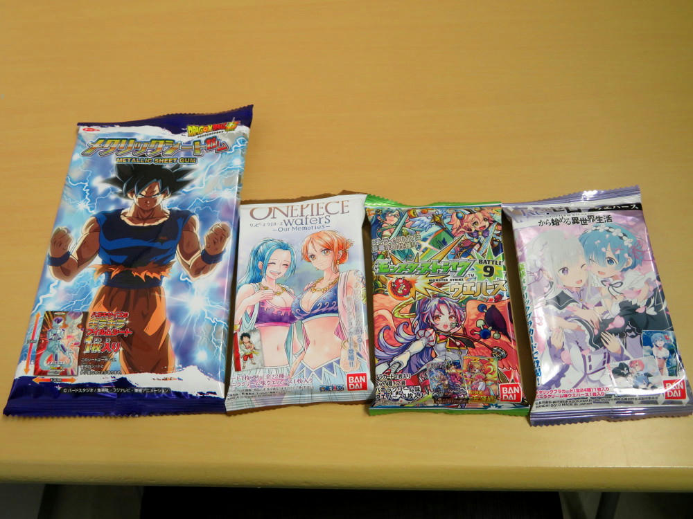 100 yen shops are extremely common in Japan now, and are kind of like Dollar Stores in the U.S. Recently, though, one of the shops had a display stand filled with packs like these (which are more often found at konbini). They're kind of like trading cards in the U.S., with one card and some kind of small snack (a dried-out wafer cookie, or a tiny piece of ramune (lemonade) chewing gum). The snacks are worthless, but I did have some interest in running the cards on the blog. Pictured here are: A big foil series for DBZ, One Piece - Waters, Monster Strike, and Re:Life.