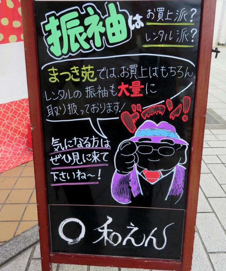 Sign found in front of a kimono shop. I think this is "Smiling Salesman," which may be incentive to keep looking for another shop.