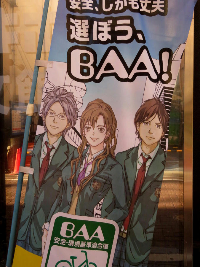This banner is located just outside the back entrance to the Don Quixote (pronounced "Donkey") discount shop in Tenmonkan. I go there to get cheap tissue, toilet paper and whiskey. I've been wondering about this banner for a long time, and I finally got around to taking a photo of it for the blog. Turns out it's kind of an ad for the Bicycle Association, of which I know nothing. I assume it's just used to identify safe bicycle parking lots.
