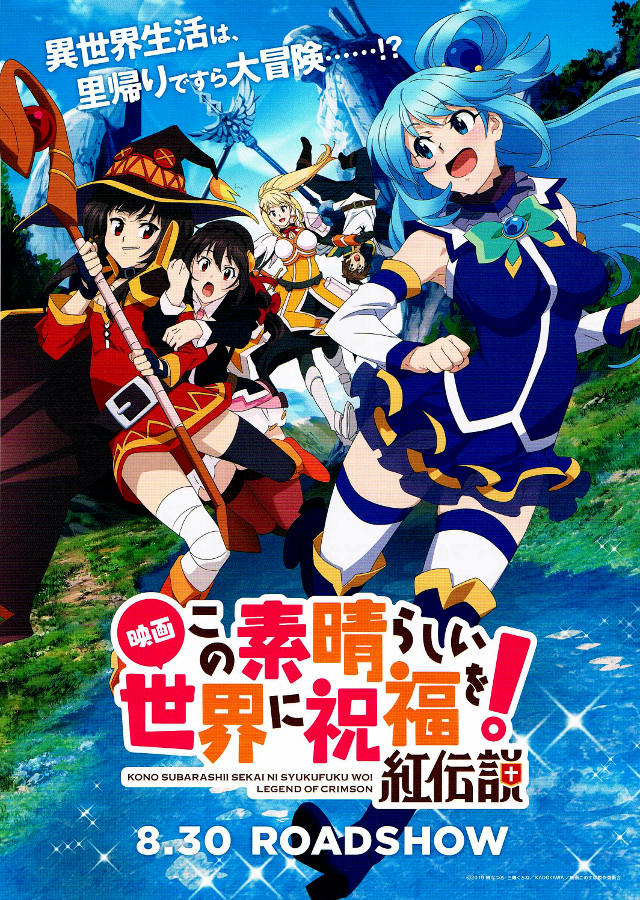 First is for something called "Kono Subararashi sekai ni shukufuku wo! Legend of Crimson" AKA: Kono Suba ("God's Blessing on this World"). According to the wiki article, it's a parody of Japanese RPGs, which started out as a web novel, got turned into a light novel series, and then adapted to manga. The movie is an adaptation of the manga. For RPG parodies, I prefer Dragon House Hunting.