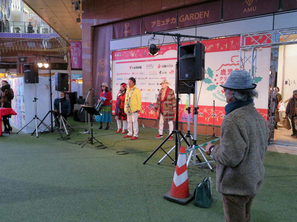 When I got up on Sunday, pretty much the first thing I did was check the Amu Plaza Christmas Market schedule to see what music acts were supposed to be playing for the day. There was nothing listed. Lots of music on Saturday, which I missed because of work, but nothing I cared at all about. And a lot for the 25th. But, nothing for Sunday or Monday. By 4 PM, I had to get out to do some shopping, but it was starting to rain. The sky was gray and dreary. I got to Amu, and some "music club" I didn't know was just starting up. They introduced themselves as the Kagoshima version of Kouhaku (the annual music Red and White TV singing contest on NHK on New Year's Eve). Nothing all that special.