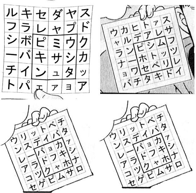 Volume 97 of Meitantei Shonan Conan (in the U.S., Case Closed) came out mid-December. Because #95 had a pseudo-cipher, I bought #97 to see what the latest storyline contained. And yes, there is an "angou" (cipher/code) this time, too. Conan is a little better than Red Rat in Hollywood, in that the author goes into the effort of explaining the tricks used in the mysteries, and the process of decoding the clues left by the villain. This time, there are four sheets of paper ruled in a 5x5 grid, with an inner 3x3 grid that has a thicker border. At first, this could be seen as some kind of route tramp, or turning grille. Spoilers, in case anyone wants to try solving these puzzles on their own.
