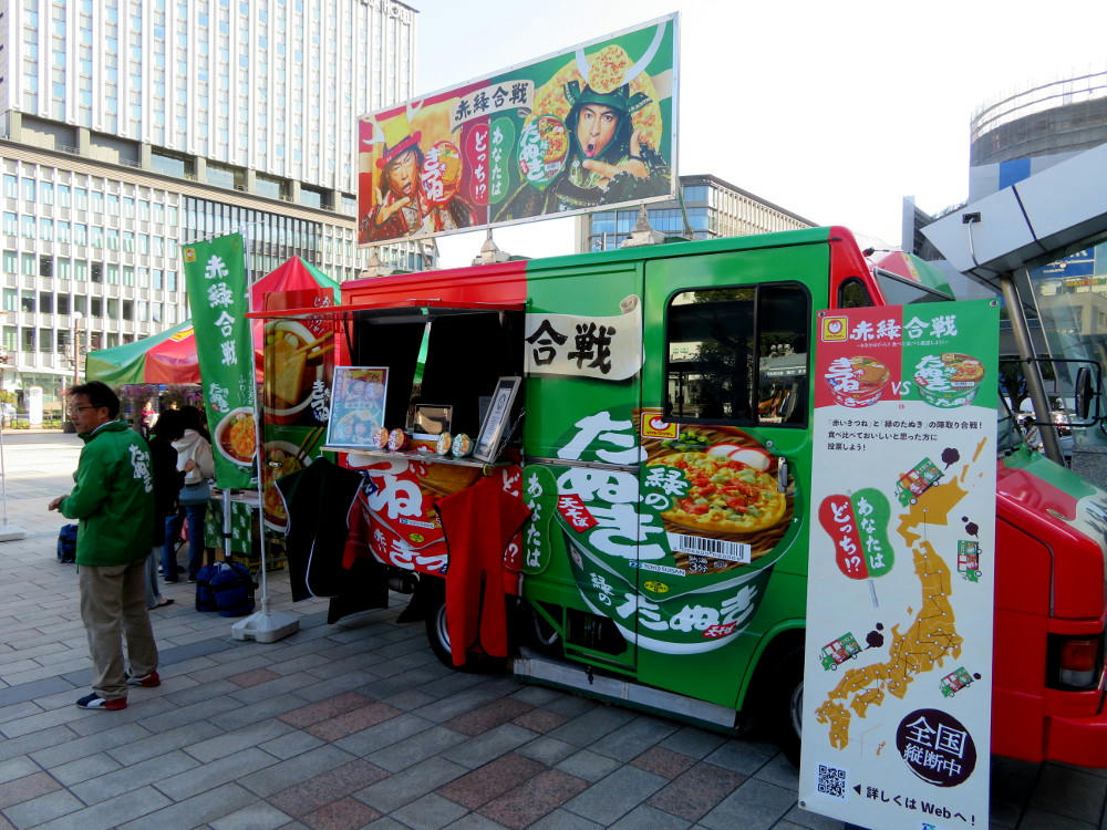When I got to Amu Plaza, the first thing I noticed was this instant udon noodle truck. Apparently, Nisshin is running an advertising campaign now where two guys in fake samurai armor argue over which of the company's two flavors of udon, kitsue (fox) or tanuki (racoon dog), tastes better (I can't find a website link for the campaign). The consumers are allowed to have the final say. The truck has been driving all over Japan, serving up both favors to anyone that wants to fill out a questionnaire afterward. There were about 10 people at the paperwork table writing down their impressions. I kind of wanted to try, too, but no one offered me a bowl. I guess I'm not part of the target market. Which is ok, because I'd just had breakfast (I sleep late) and wasn't at all hungry then.