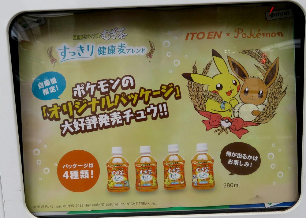 Ito En, a company that has vending machines for their own (actually, less popular) drinks has a tie-in with Pokemon for their mugi-cha (tea made from roasted barley).