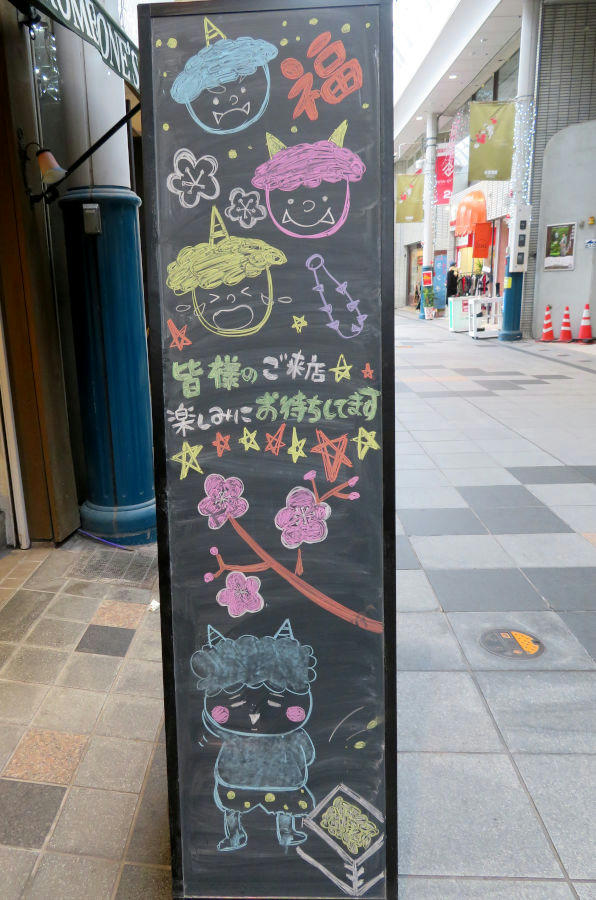 Trombone cafe has its latest chalk art out, this one for Setsubun (Feb. 3) (throwing dried beans at oni to wish for good luck.