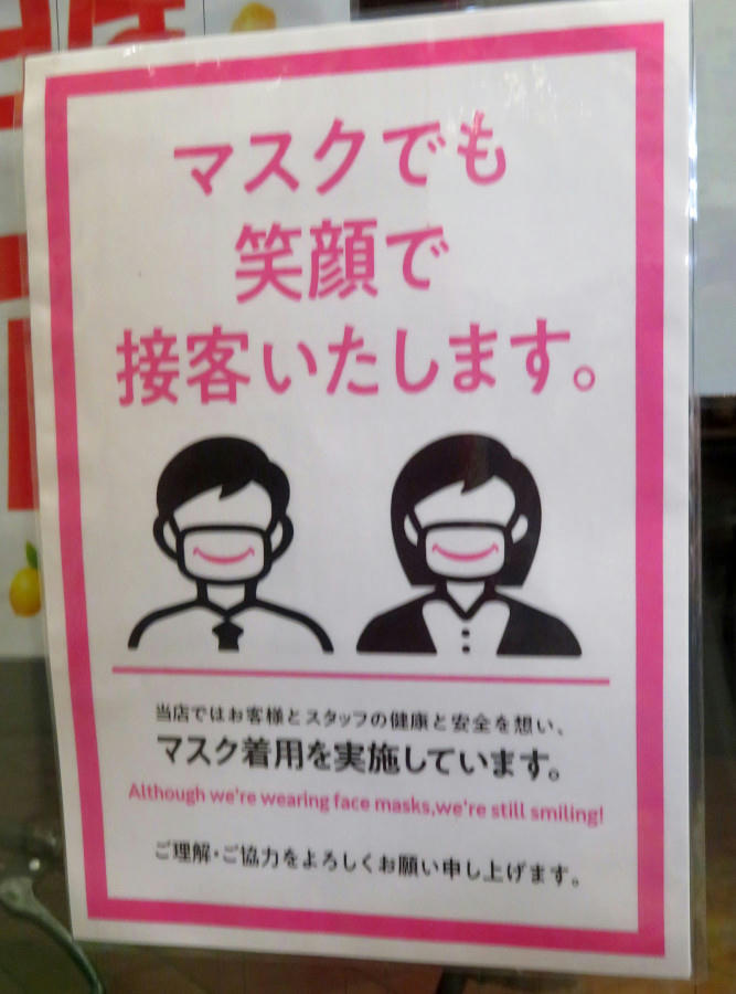 Fuzzy sign on the glass doors for Shiroyama supermarket.