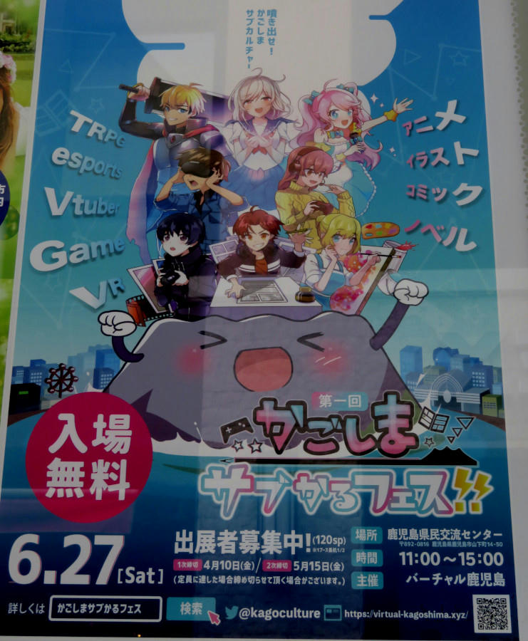 Ad poster for the upcoming subculture event June 27th. Video games, anime, animesong and illustrations. Kagoshima Bunka Hall. One day only, free admission.