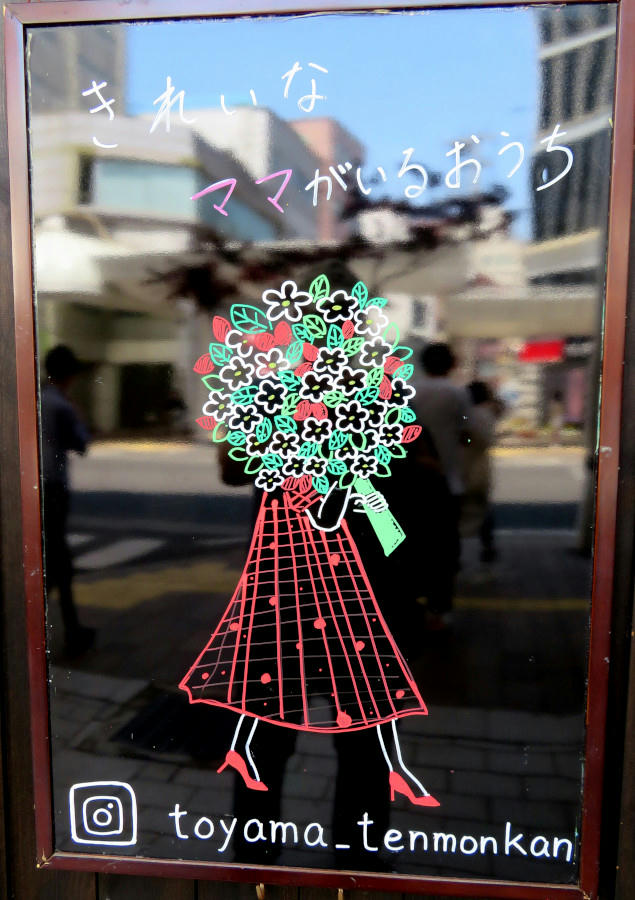 Chalk art for Toyama beauty salon, for Mother's Day. "If you can't afford roses, you can't afford us."